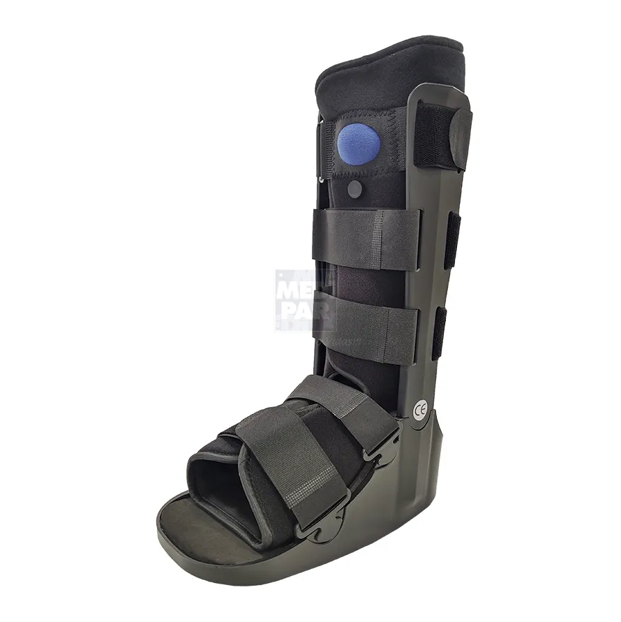 Cuenta con un sistema neumático con válvula de llenado y botón liberador de aire, que permite una compresión personalizada para el pie y el tobillo, lo que aumenta la estabilidad y el confort. Elaborada en plástico rígido con tela acojinada. Suela balancín antiderrapante que permite hacer la carga directa o parcial para absorber el impacto y evitar lesiones secundarias