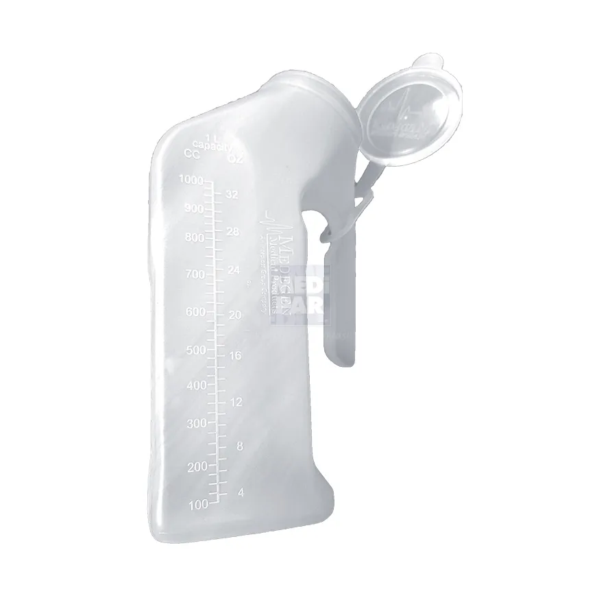 Orinal masculino, está elaborado en un plástico translucido que permite medir y ver el contenido. Tiene una graduación en incrementos de 25 ml.